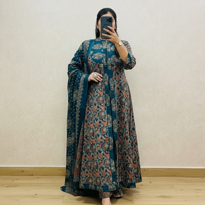 Teal Blue Floral Embroidered Kurta Set with Dupatta
